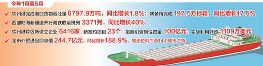 其中,钦州港开通了泰国林查班至北部湾钦州港首轮榴莲快线以及陆海新通道RCEP—北部湾港—河南海铁联运双向对开班列,“广元—钦州港”西部陆海新通道铁海联运班列完成首发,开辟了“阿联酋—钦州—兰州”“东南亚—钦州—西安”“俄罗斯—重庆—广西”等多条海铁联运线路,增加了印度原糖、中东进口汽车等特色品类货物运输,成为拉动西部地区经济社会发展、畅通国内国际双循环的强劲引擎。今年1月至5月,钦州港完成港口货物吞吐量6797.9万吨,同比增长1.8%;集装箱完成197.5万标箱,同比增长17.5%;西部陆海新通道开行海铁联运班列3371列、同比增长40%;外贸进出口预计完成173亿元、同比增长138%。