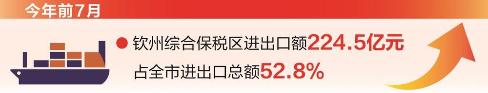近年来,钦州综合保税区积极打造国内国际双循环市场经营便利地,形成了保税加工、保税物流、国际贸易、港航服务等特色产业体系。在保税加工领域,粮食、棉纺、食盐、水果、液晶显示屏等多类型加工贸易产业纷纷入驻;保税物流业务涵盖了原油、红酒、整车进口、冷链等;贸易新业态如原油、锰硅合金期货交割、大豆离岸现货交易、大宗商品保税金融交易等蓬勃发展。今年前7月,钦州综合保税区进出口额224.5亿元,占全市进出口总额的52.8%,成为推动区域经济发展的重要引擎。