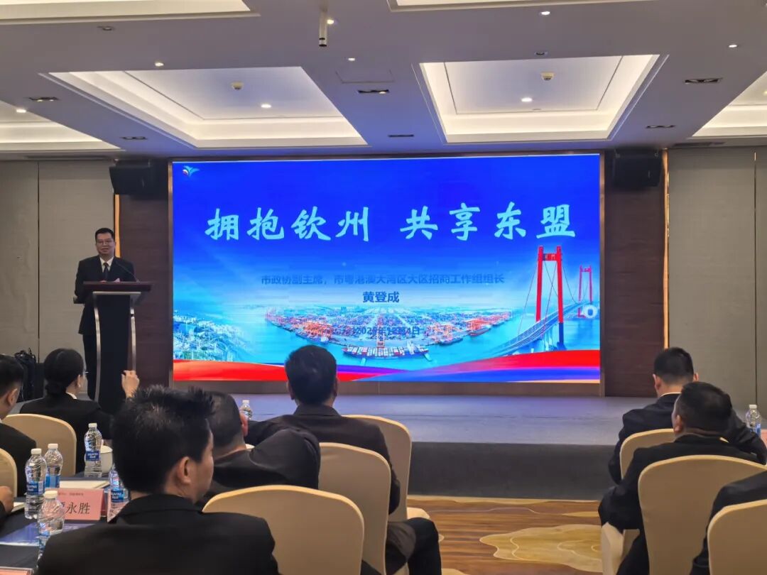 2025年12月4日下午,“拥抱钦州,共享东盟 ——2025 钦州产业空间生态(深圳)推介会” 在深圳登喜路国际大酒店成功举办。来自粤港澳大湾区的 80 余位企业家代表,与钦州市招商团队齐聚一堂,共商跨区域合作、共谋东盟市场发展新机。钦州市政协副主席、市粤港澳大湾区大区招商工作组组长黄登成出席并致辞,市园区办冯静副主任主持推介会。