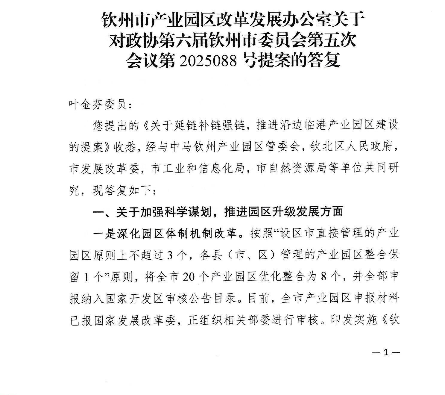 钦州市产业园区改革发展办公室关于对政协六届五次会议第2025088号提案的答复