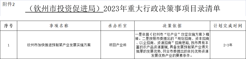 钦州市投资促进局2023年重大行政决策事项目录清单