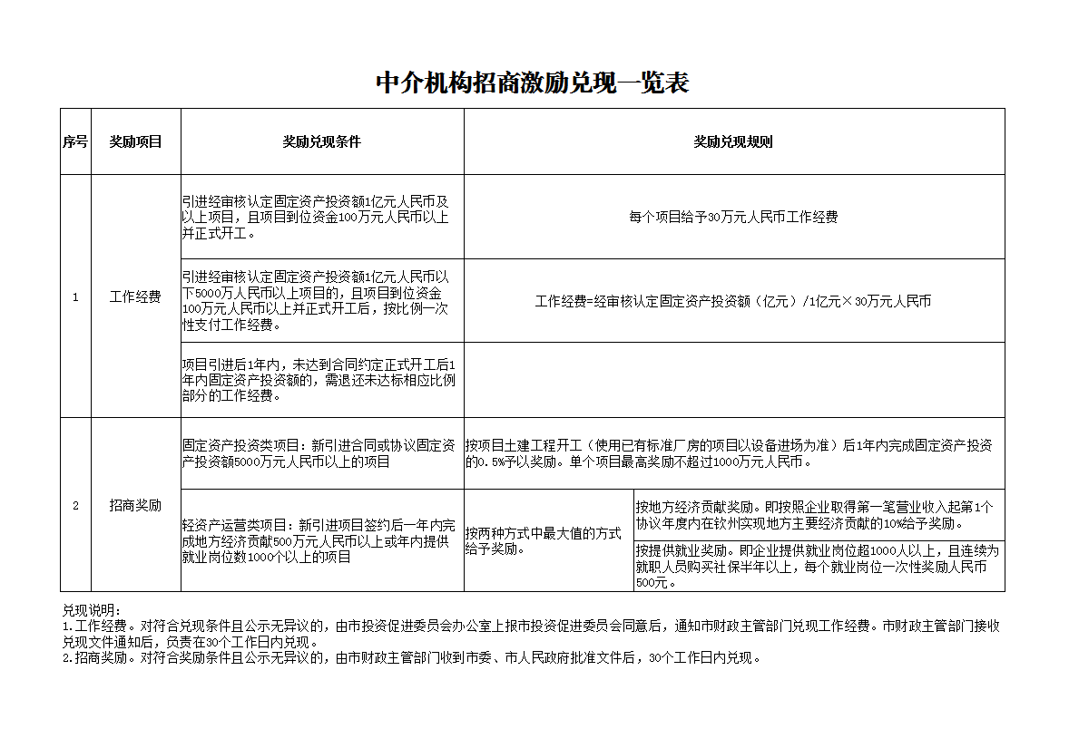 市场化招商奖励兑现一览表